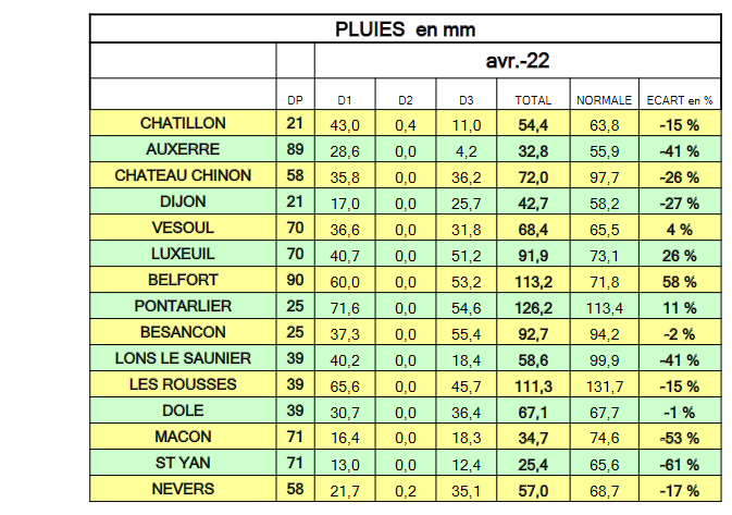 En avril, on observe un excédent de pluie à l’Est et un déficit sur la moitié Ouest de la région, et surtout aucune pluie en milieu de mois. Enfin, les températures fraîches