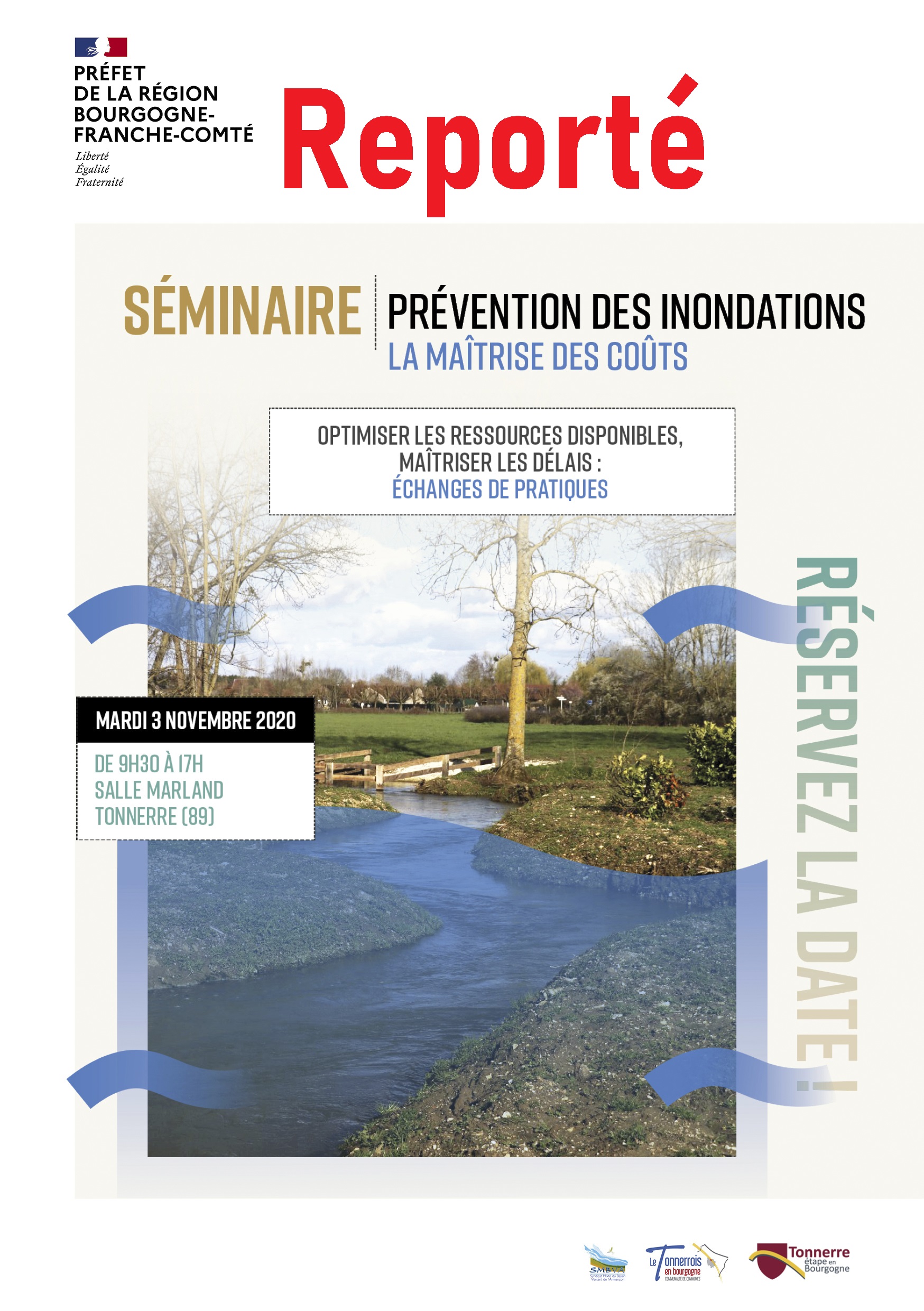 Le séminaire régional d'échanges entre collectivités sur la gestion des inondations prévu le 3 novembre prochain à Tonnerre dans l'Yonne est annulé.