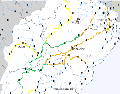 Les tronçons du Doubs en amont de la Loue, de l'Ognon en amont de la Linotte et de l'Arroux-Bourbince sont toujours en vigilance orange.