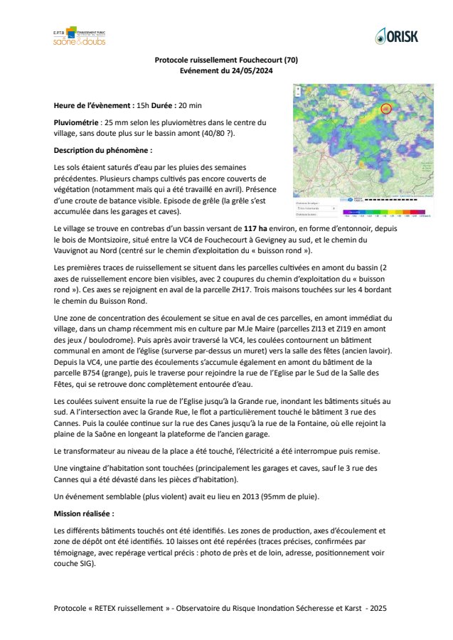 Synthèse de l'évènement de ruissellement du 24/05/2024 en 70