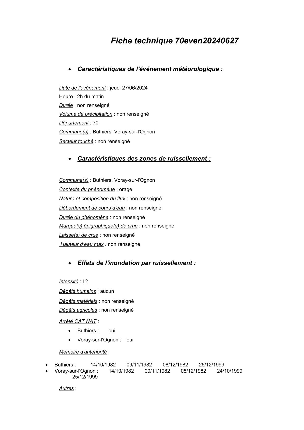 Synthèse de l'évènement de ruissellement du 27/06/2024 en 70