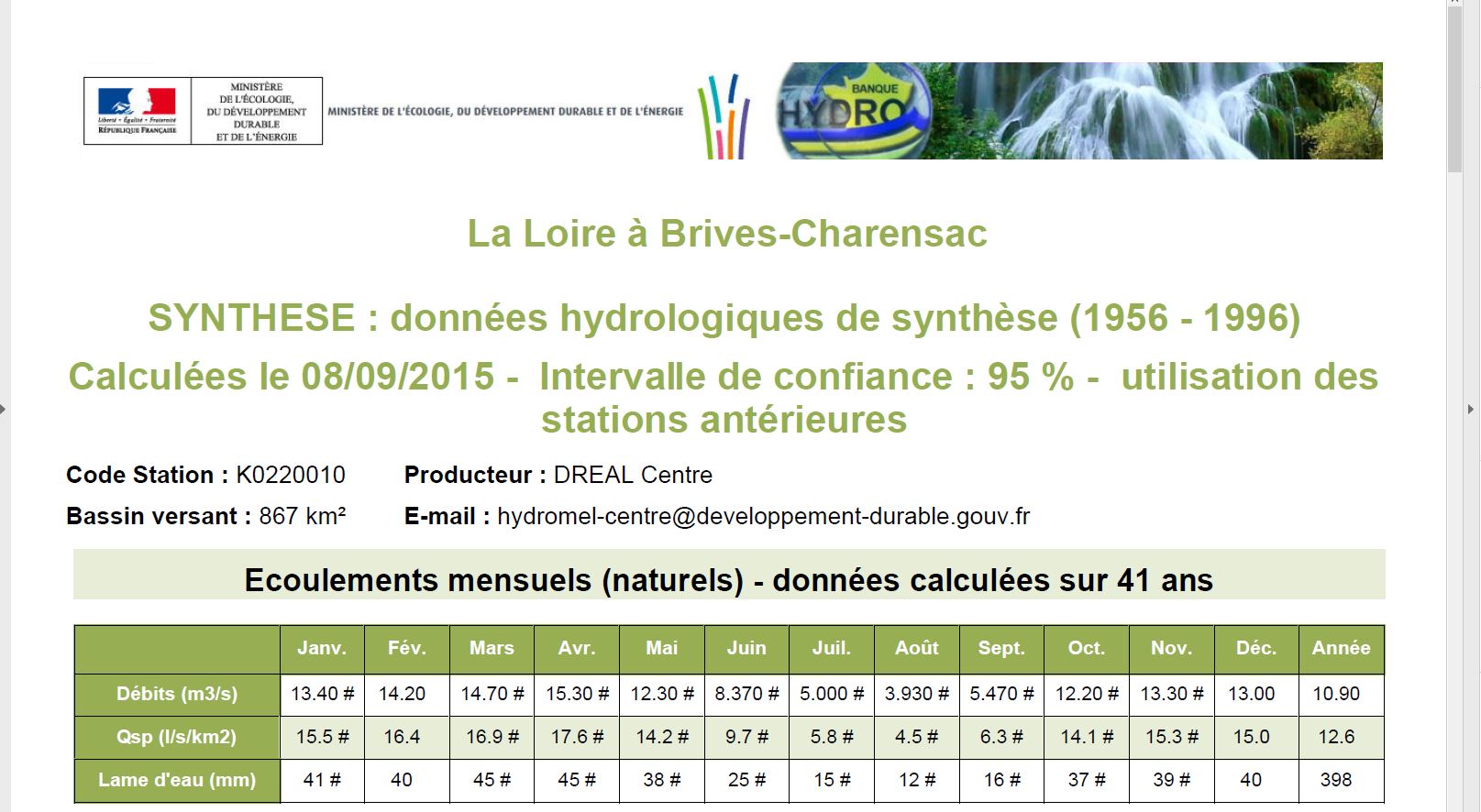 Synthèse : Données hydrologiques de synthèse