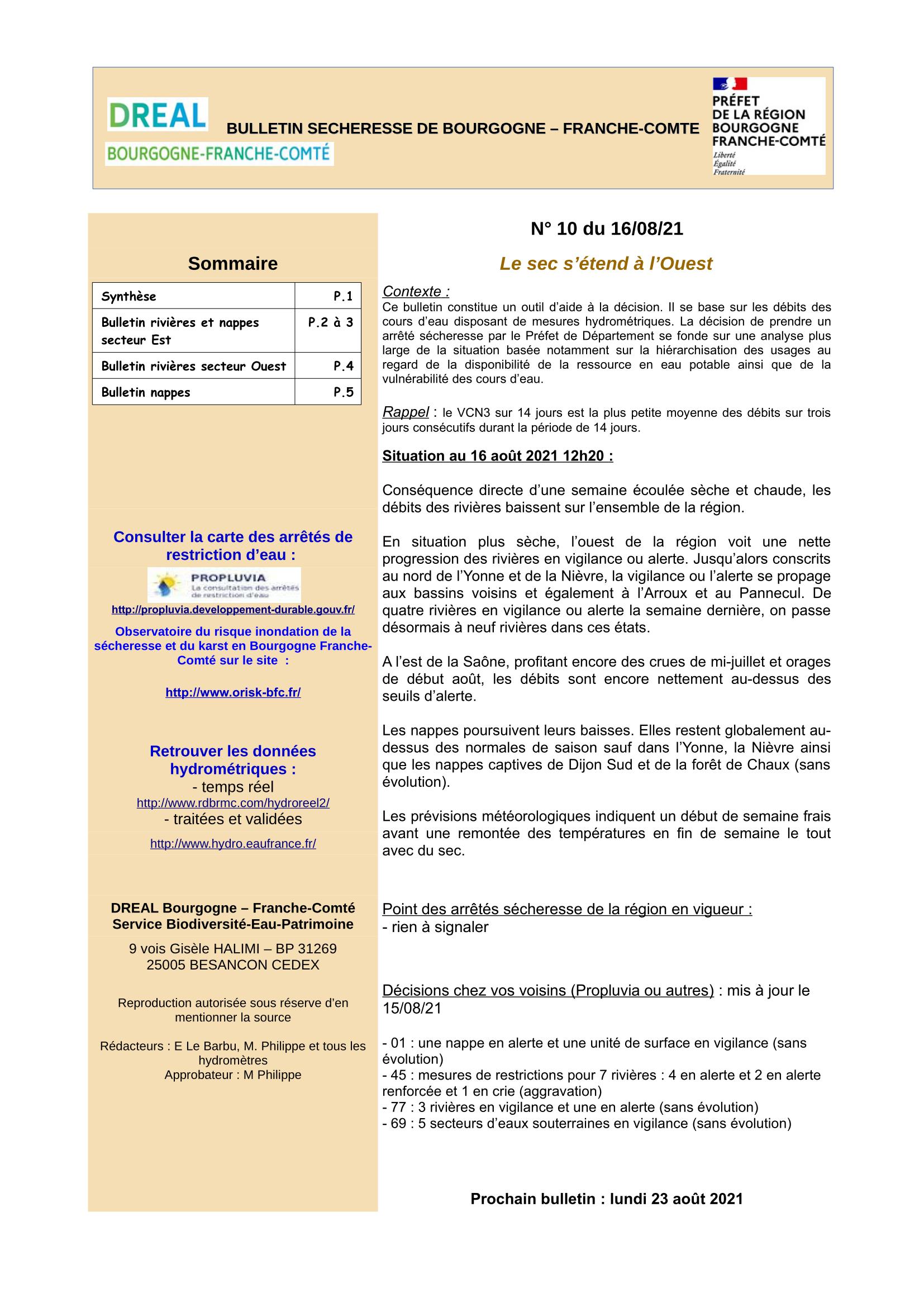 Bulletin Sécheresse BFC n°10 du 16-08-2021