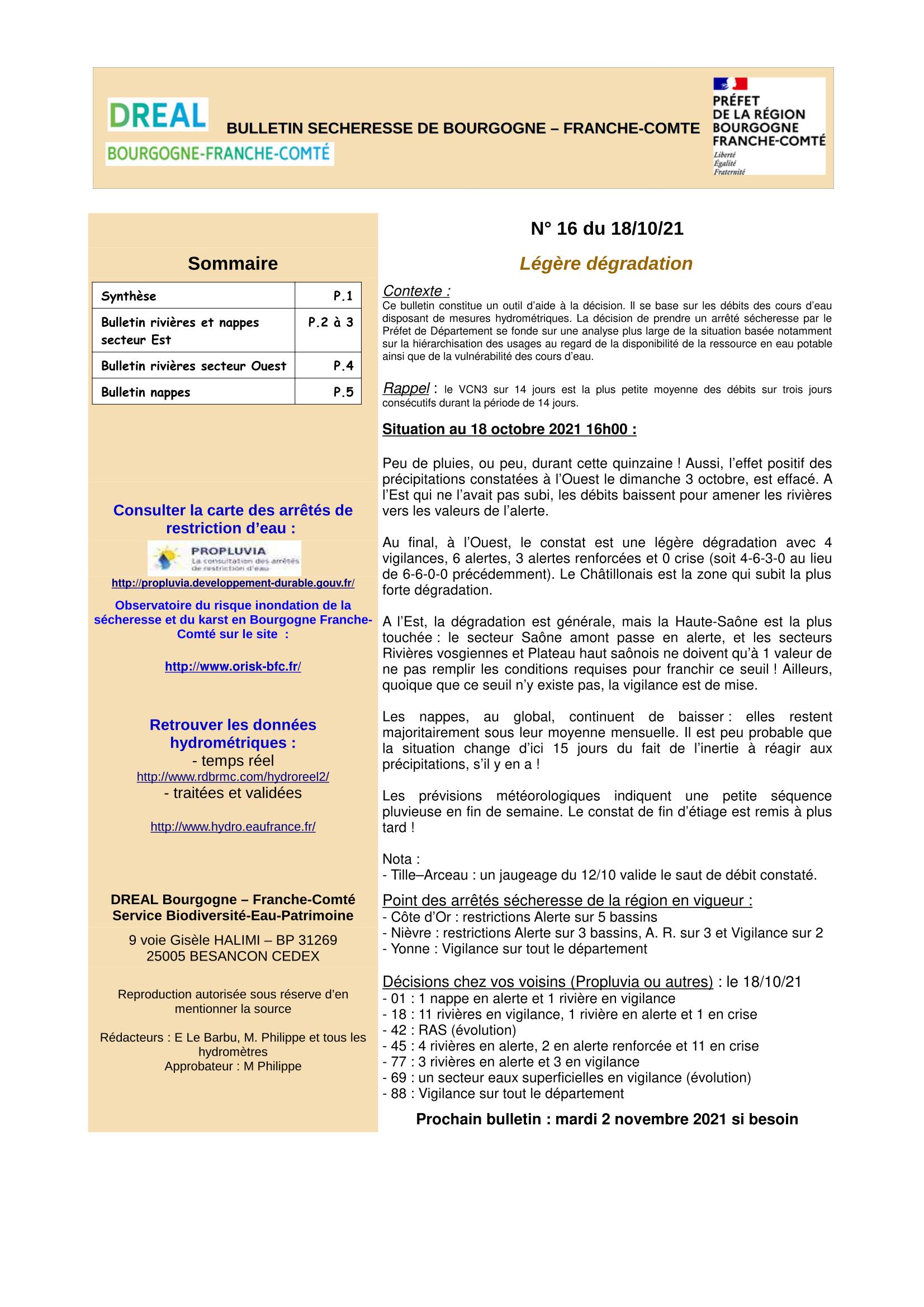 Bulletin Sécheresse BFC n°16 du 18-10-2021