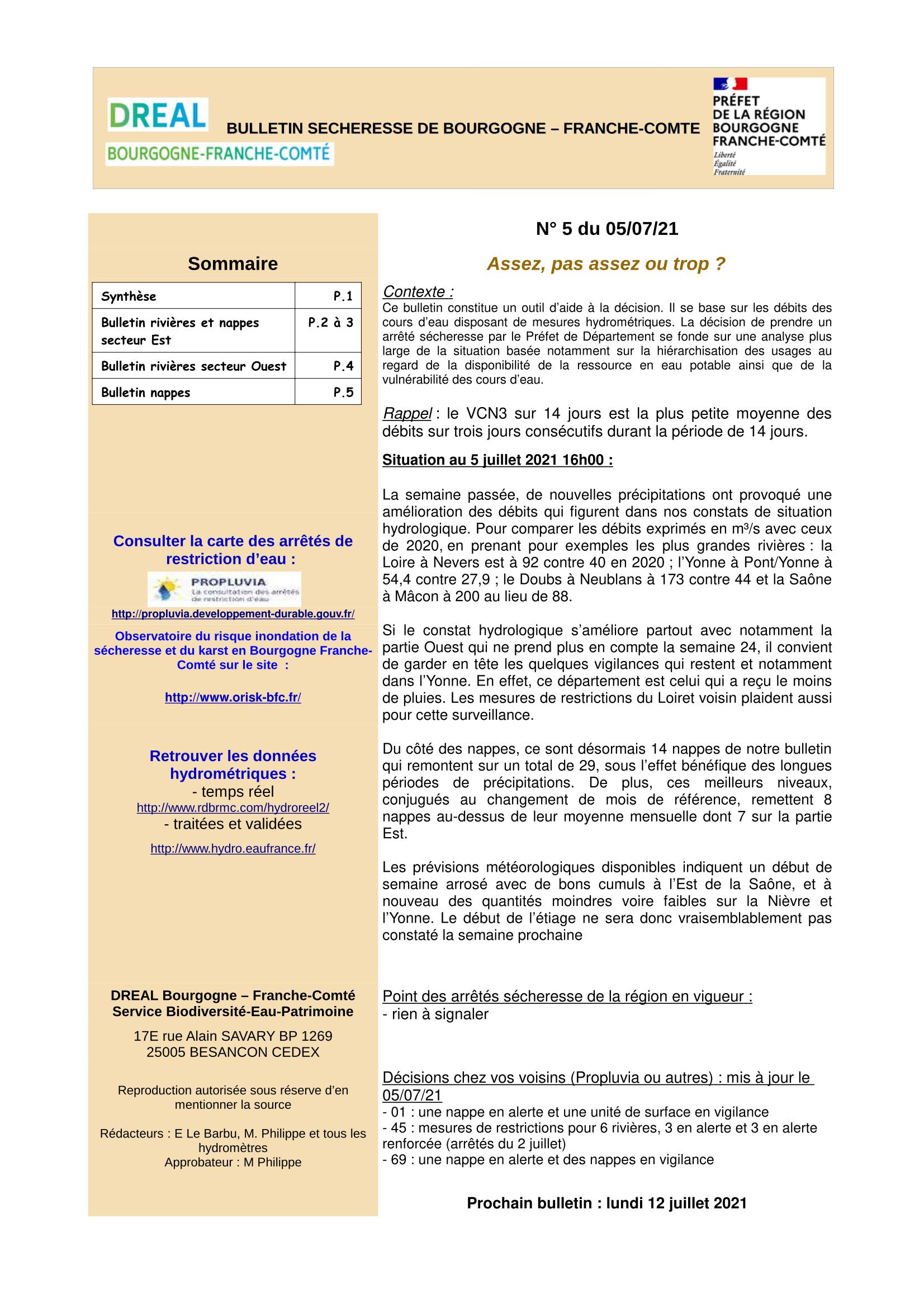 Bulletin Sécheresse BFC n°5 du 05-07-2021