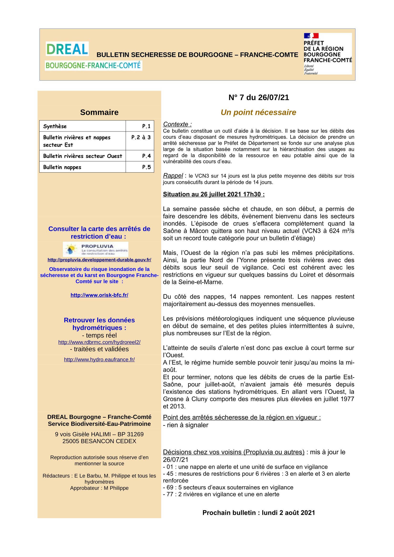 Bulletin Sécheresse BFC n°7 du 26-07-2021