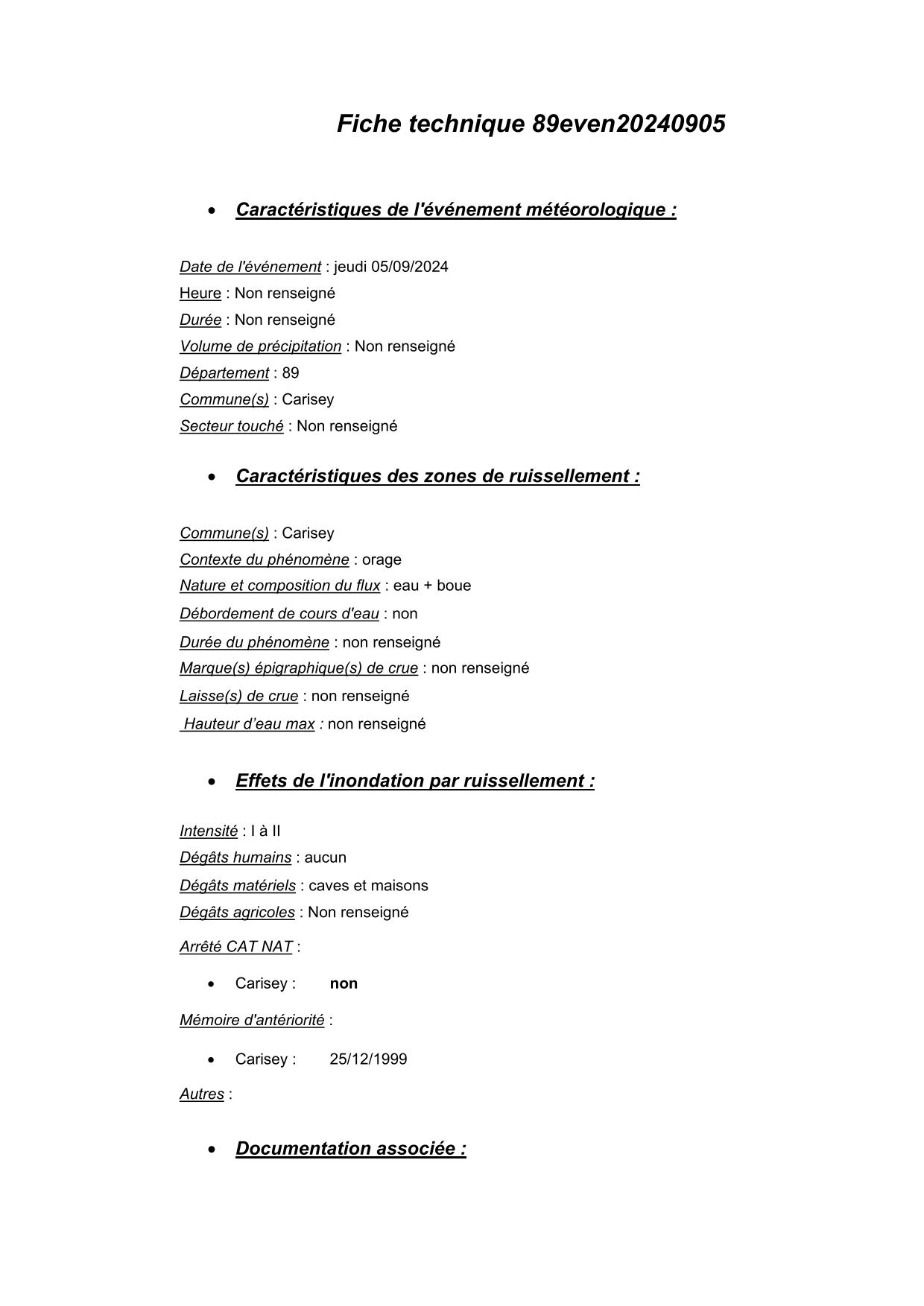 Synthèse de l'évènement de ruissellement du 05/09/2024 en 89