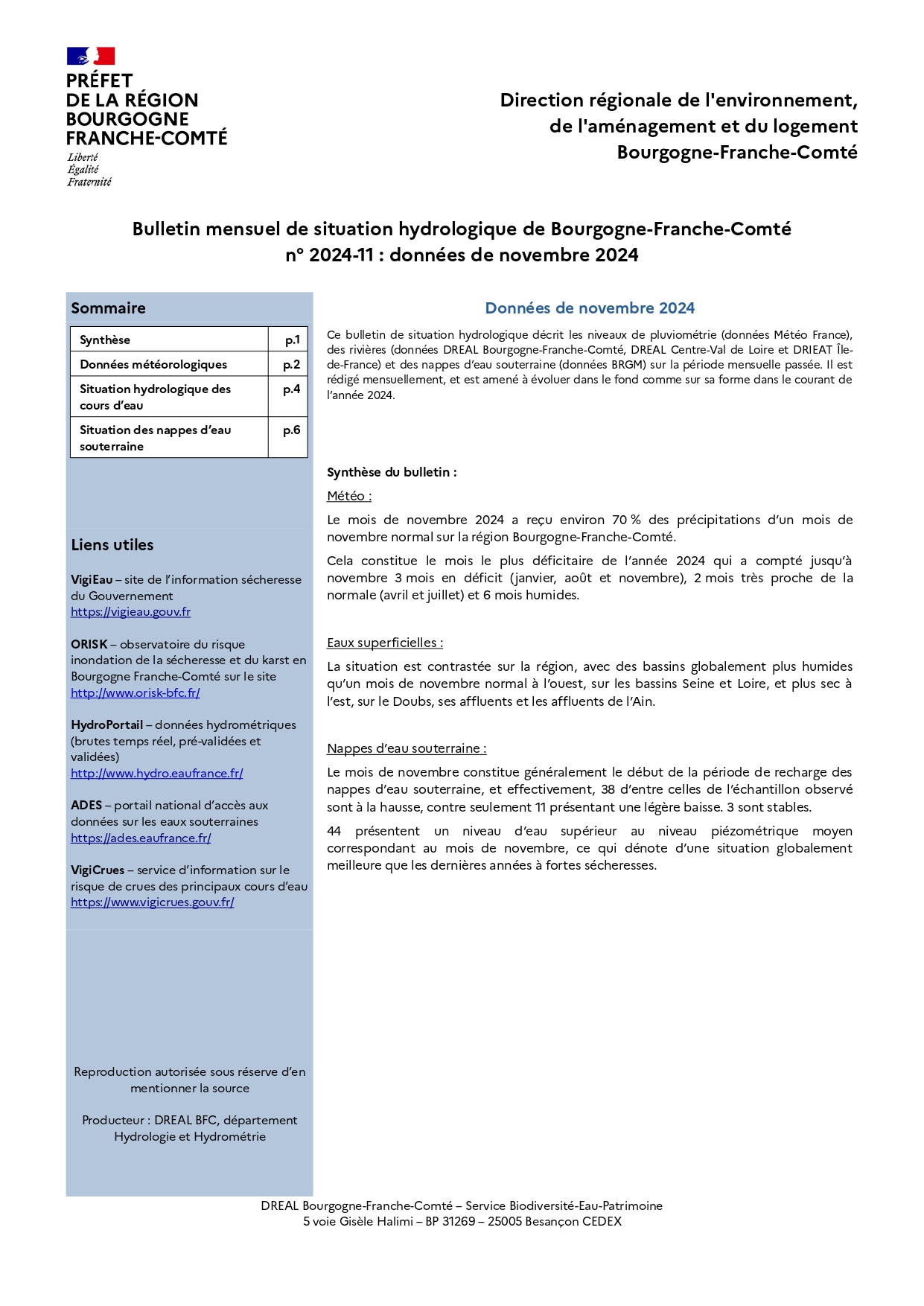 Bulletin mensuel de situation hydrologique n°2024-11 : données de novembre 2024