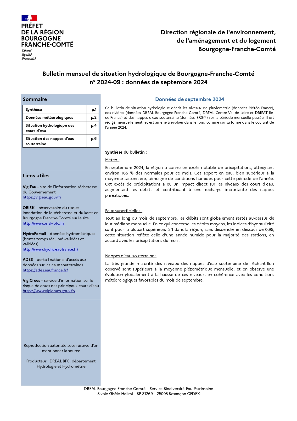 Bulletin mensuel de situation hydrologique n°2024-09 : données de septembre 2024