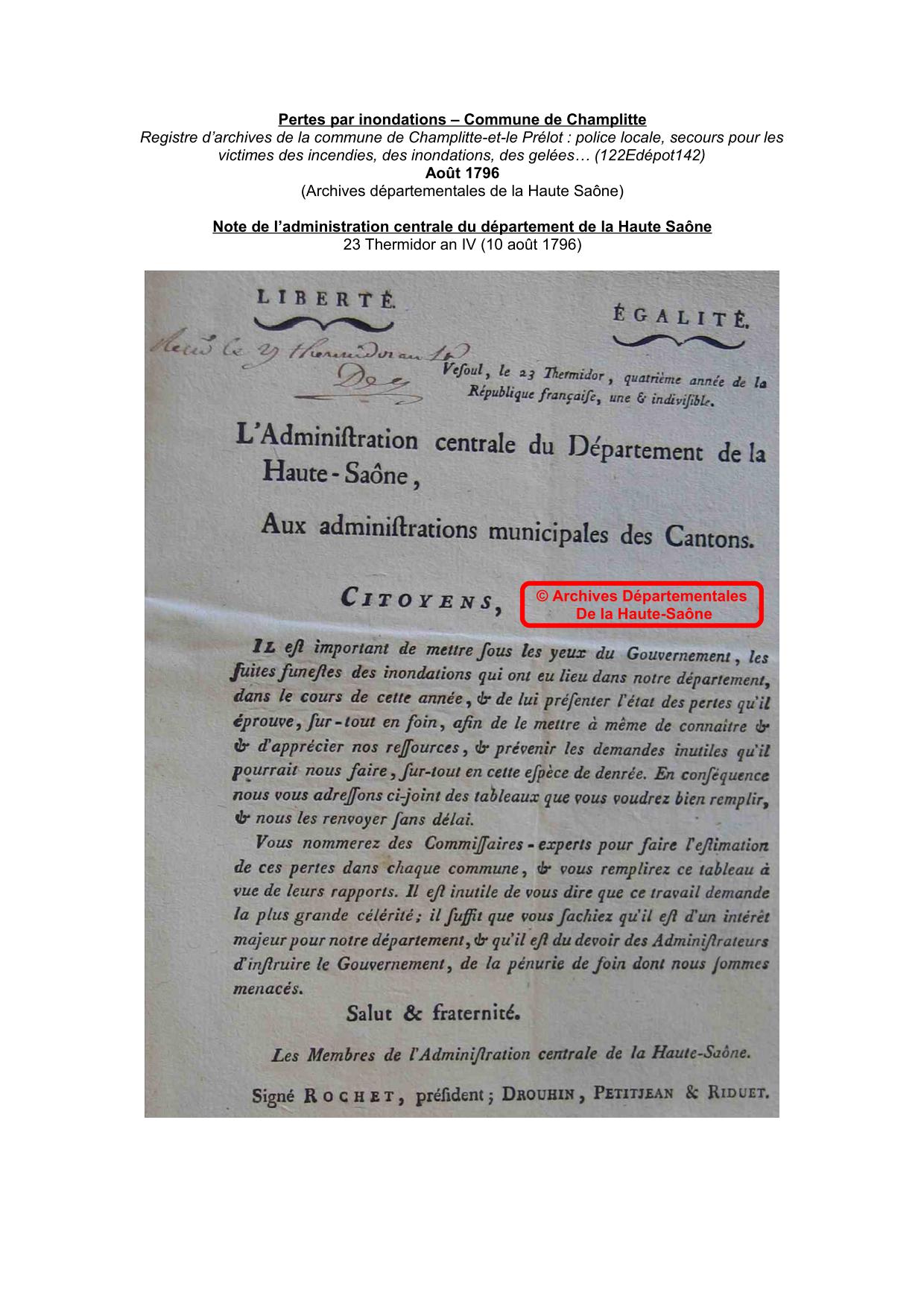 Pertes par inondations – Commune de Champlitte Registre d’archives de la commune de Champlitte-et-le Prélot : police locale, secours pour les victimes des incendies, des inondations, des gelées… (122