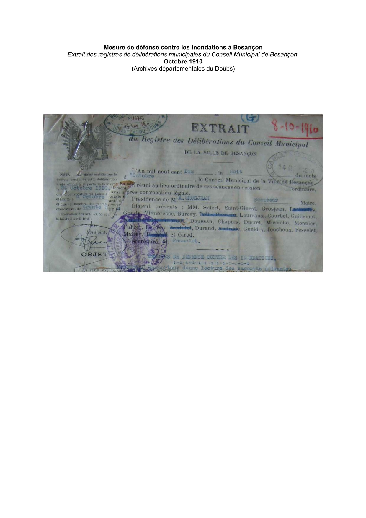 Extrait des registres de délibérations municipales du Conseil Municipal de Besançon