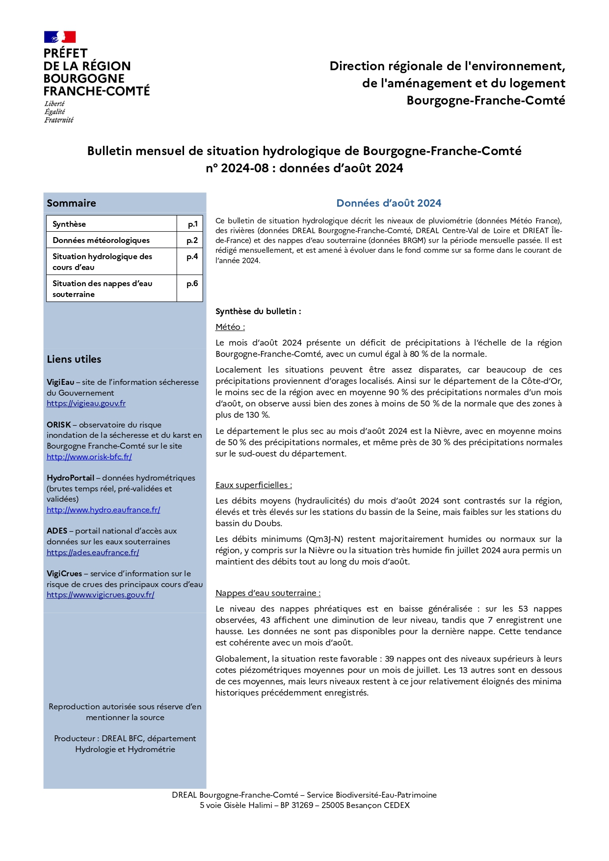 Bulletin mensuel de situation hydrologique n°2024-08 : données d'août 2024