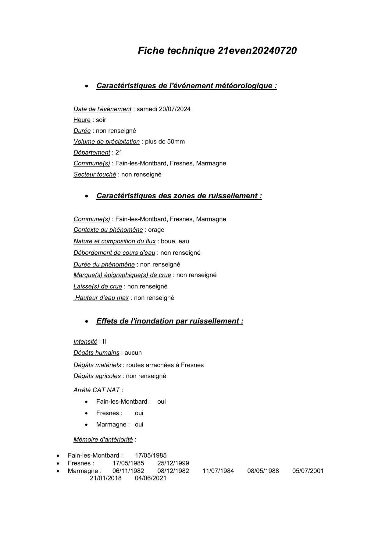 Synthèse de l'évènement de ruissellement du 20/07/2024 en 21