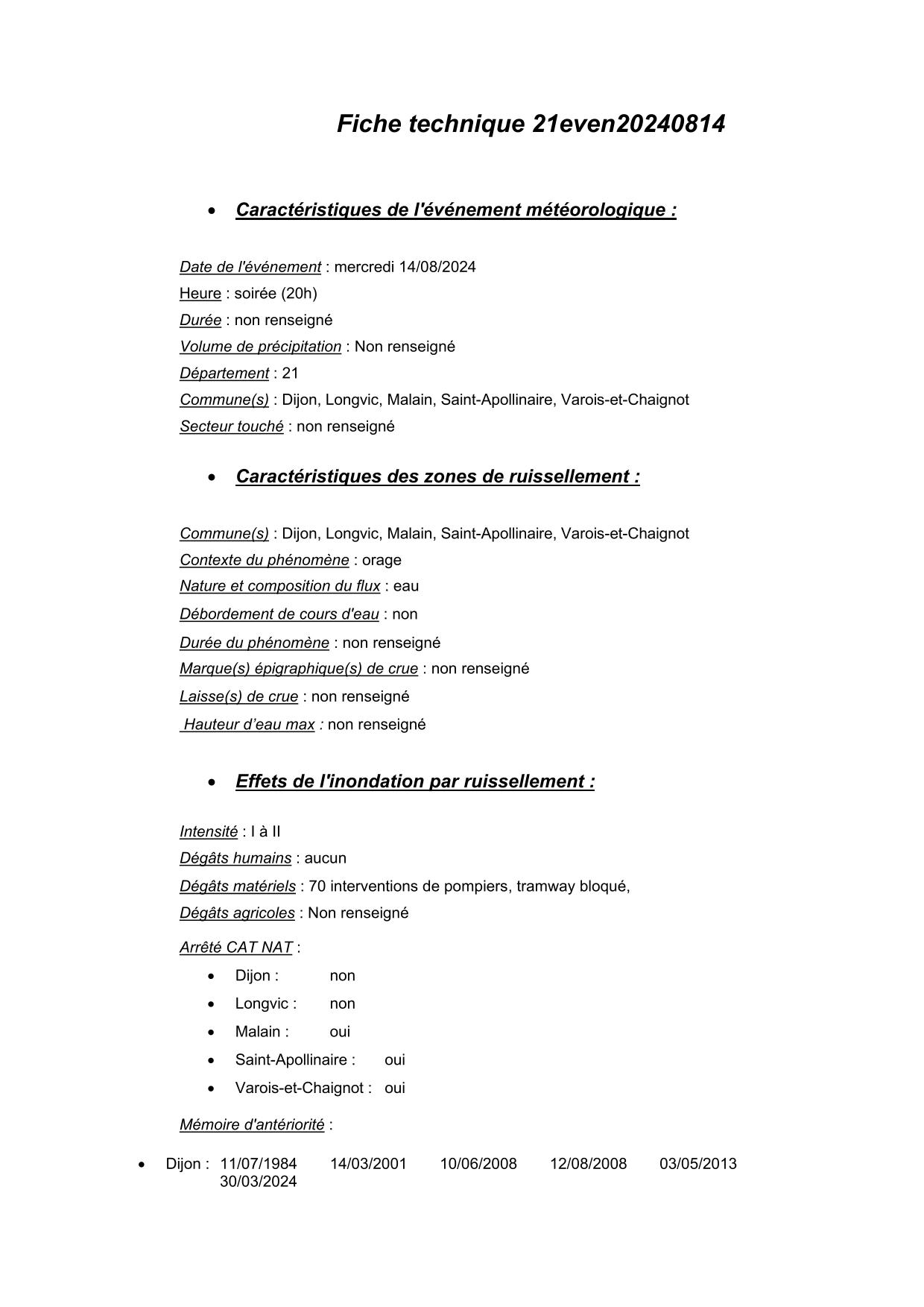 Synthèse de l'évènement de ruissellement du 14/08/2024 en 21