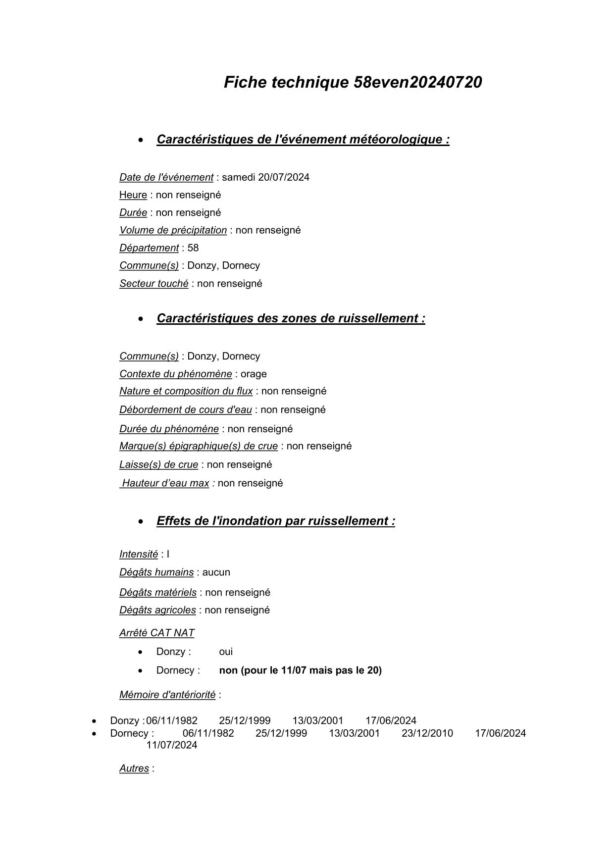 Synthèse de l'évènement de ruissellement du 20/07/2024 en 58