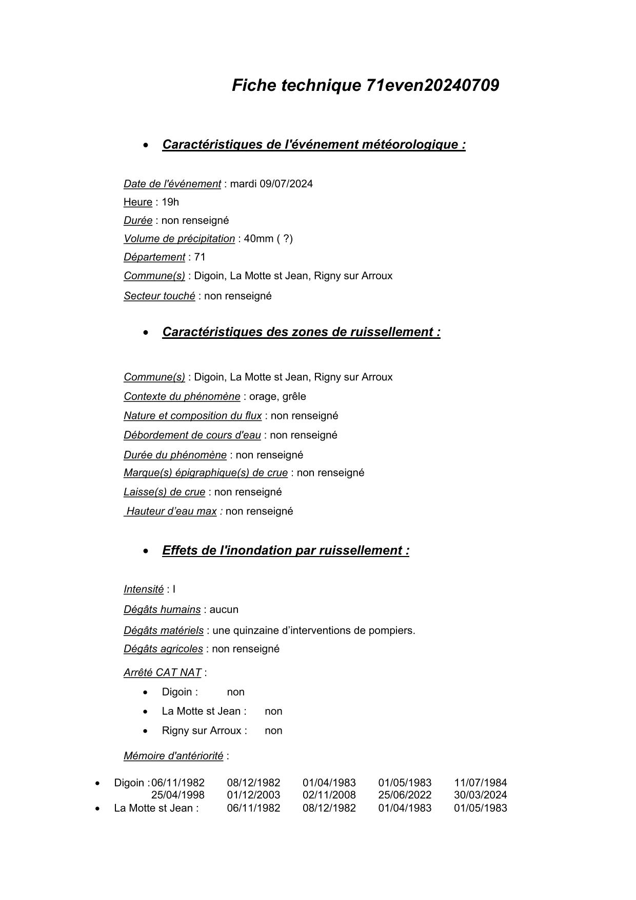 Synthèse de l'évènement de ruissellement du 09/07/2024 en 71