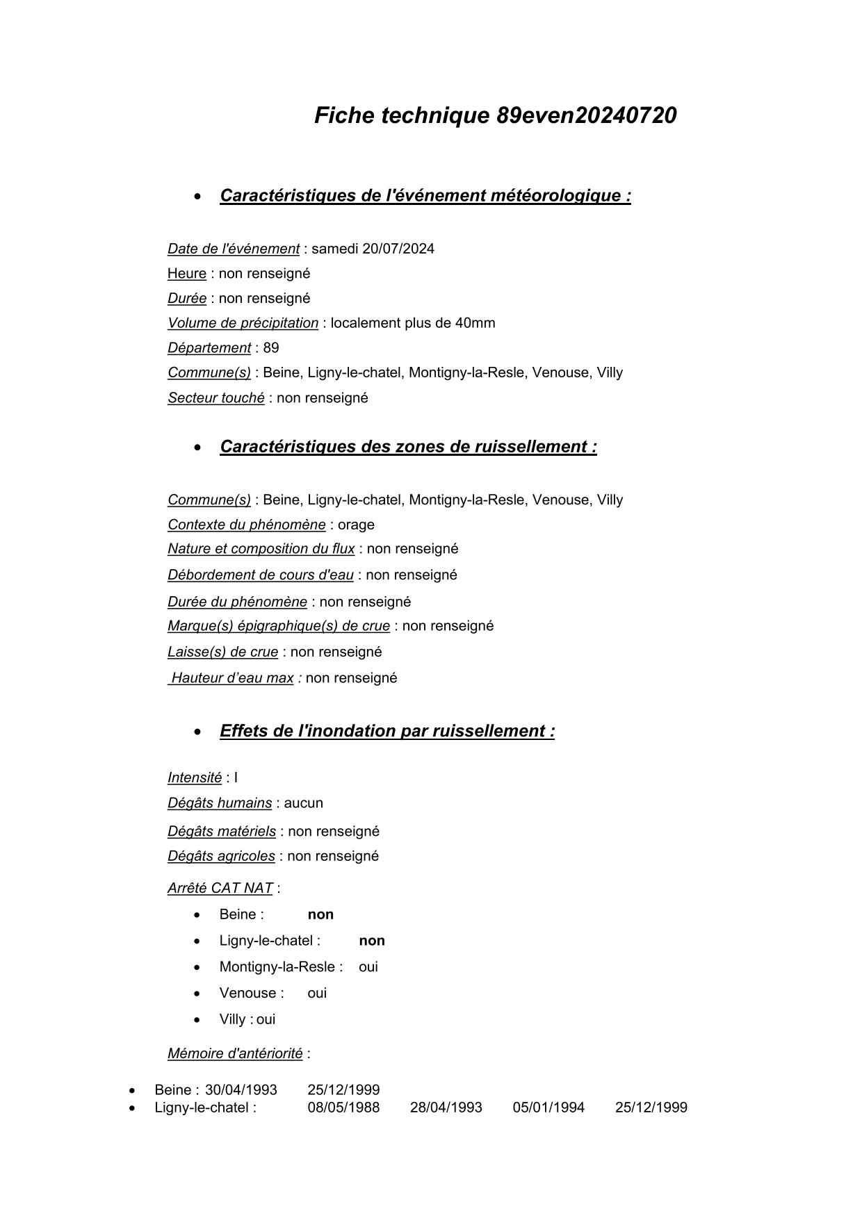 Synthèse de l'évènement de ruissellement du 20/07/2024 en 89