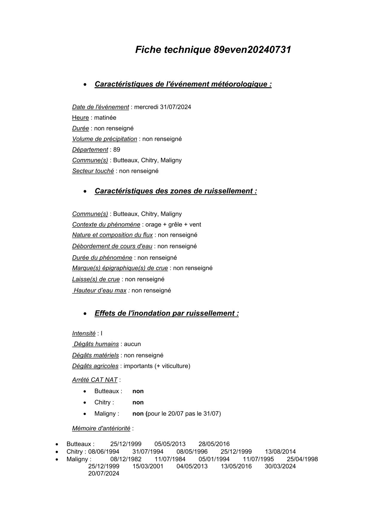 Synthèse de l'évènement de ruissellement du 31/07/2024 en 89