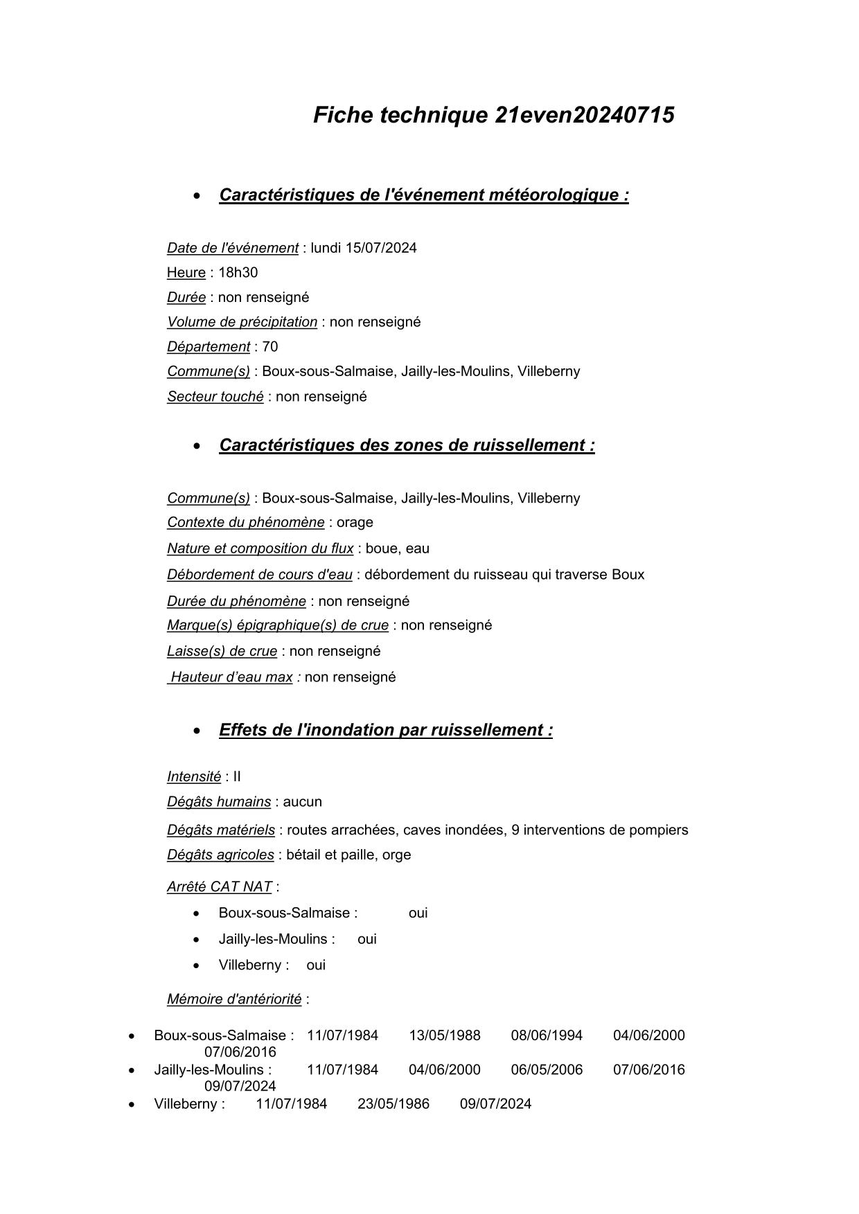 Synthèse de l'évènement de ruissellement du 15/07/2024 en 21