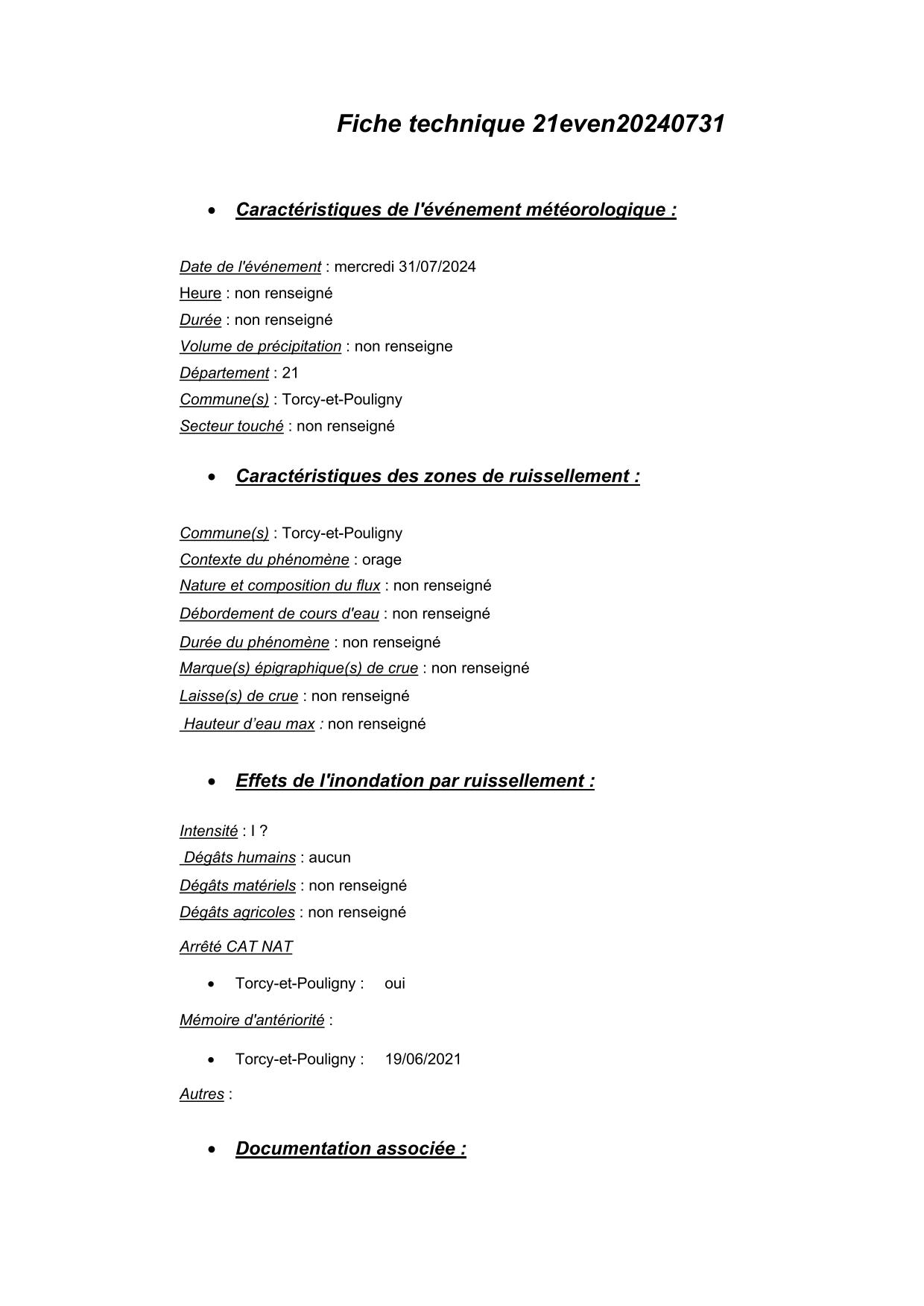 Synthèse de l'évènement de ruissellement du 31/07/2024 en 21