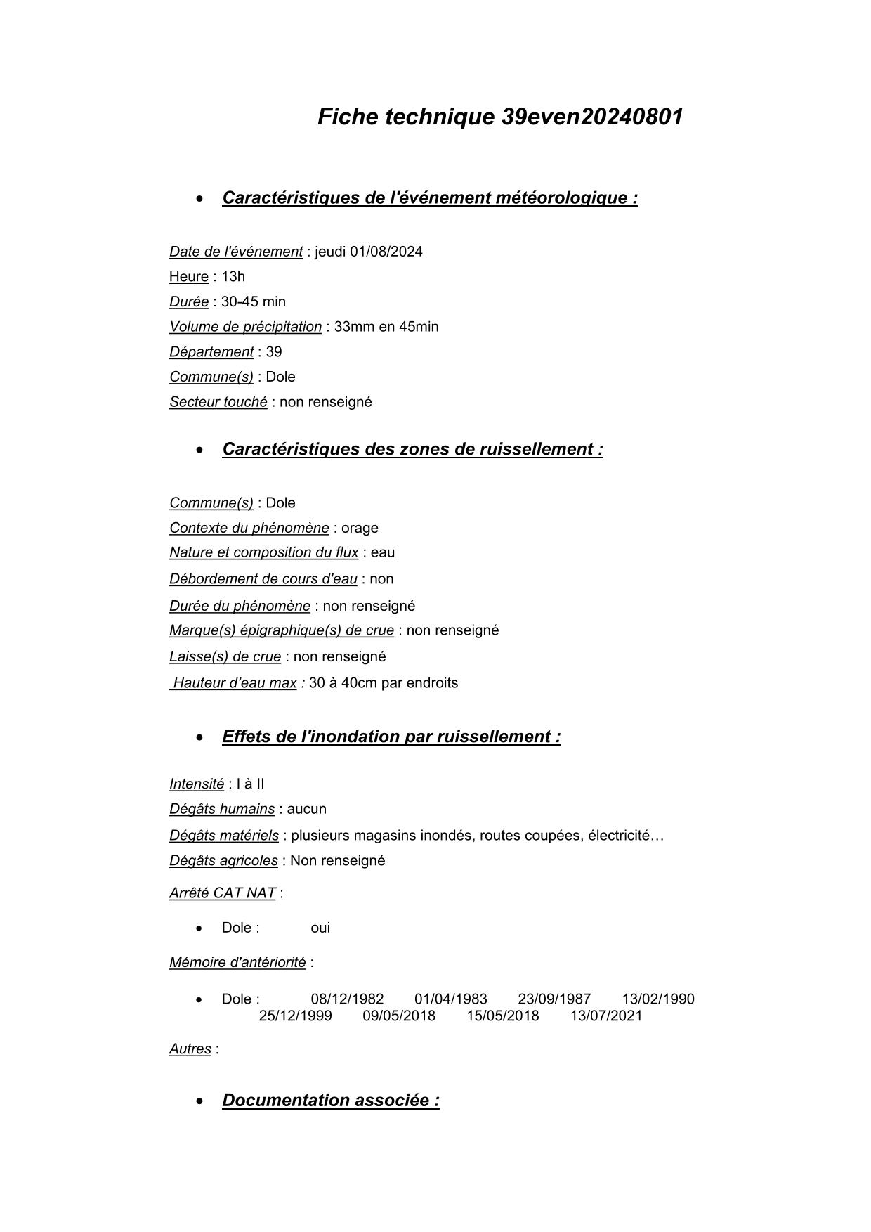Synthèse de l'évènement de ruissellement du 01/08/2024 en 39