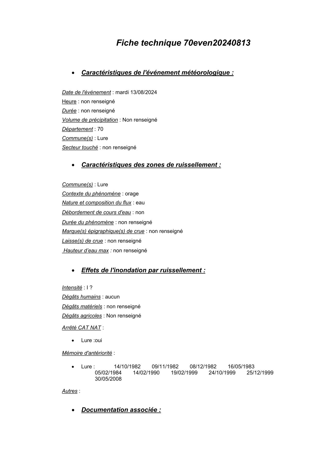 Synthèse de l'évènement de ruissellement du 13/08/2024 en 70