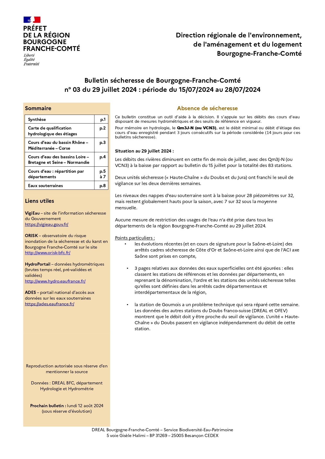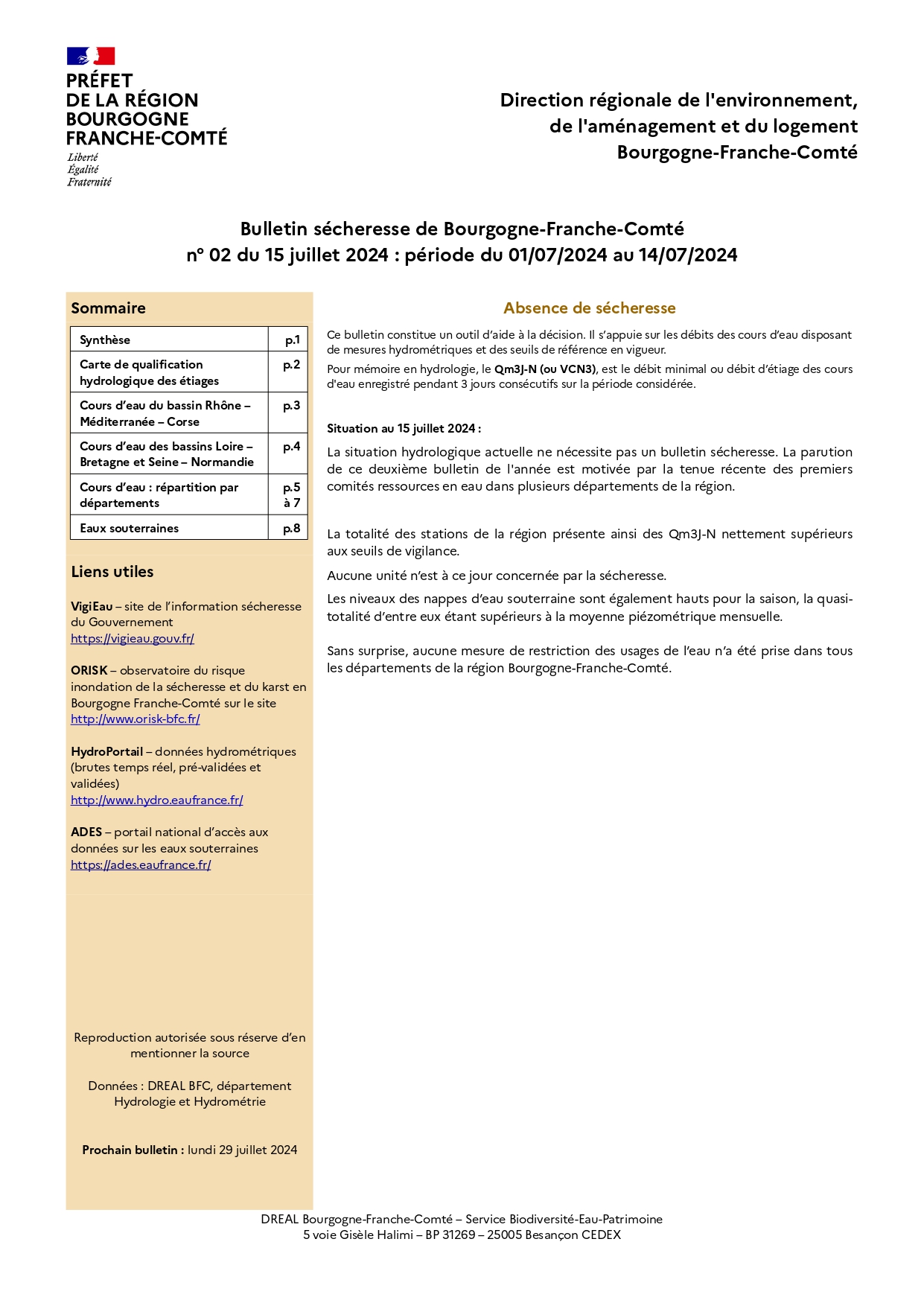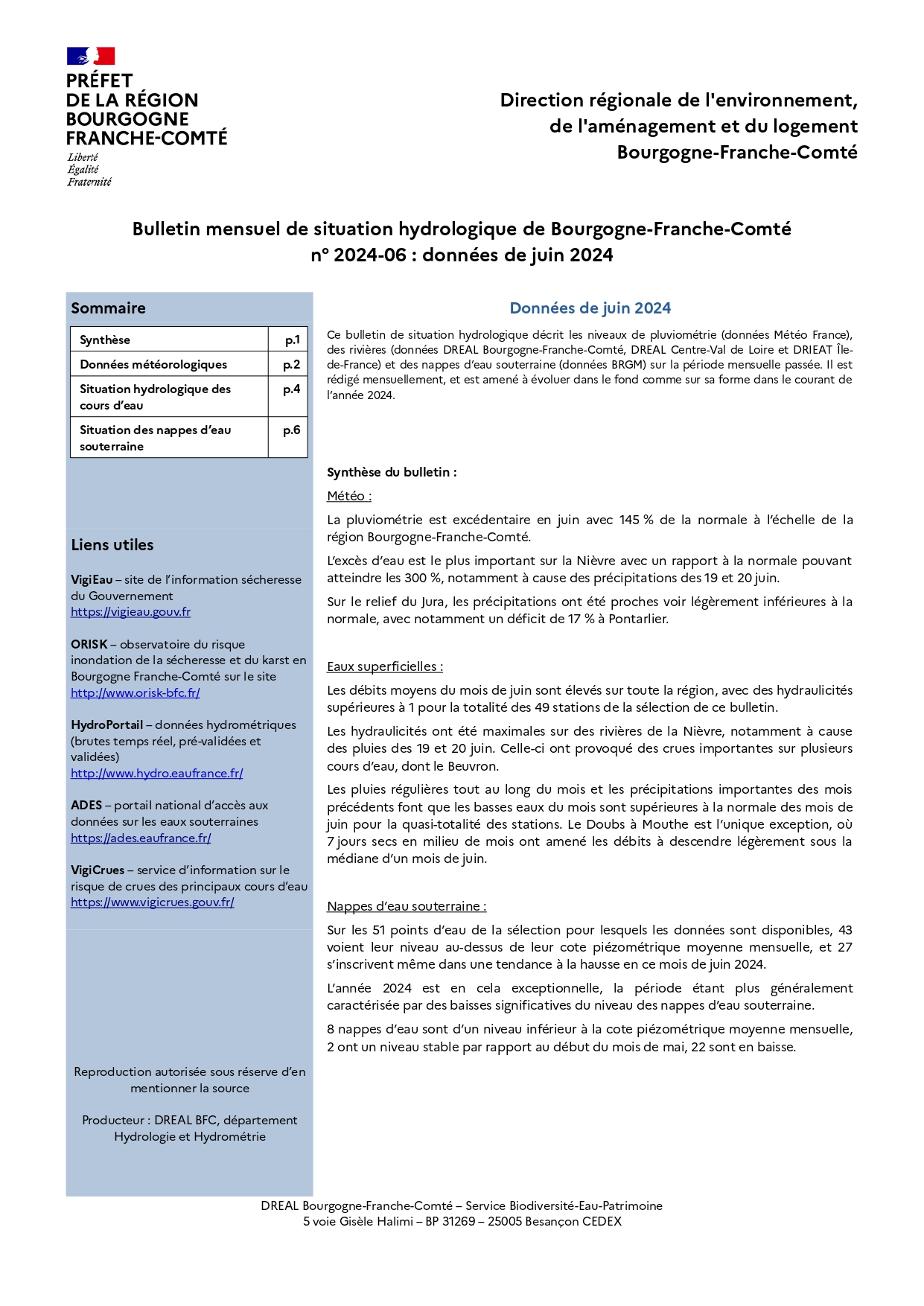 Bulletin mensuel de situation hydrologique n° 2024-06 : données de juin 2024