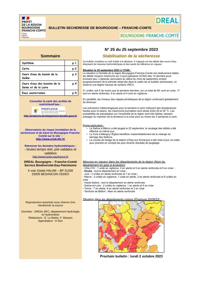 Bulletin Sécheresse BFC n°25 du 25-09-2023