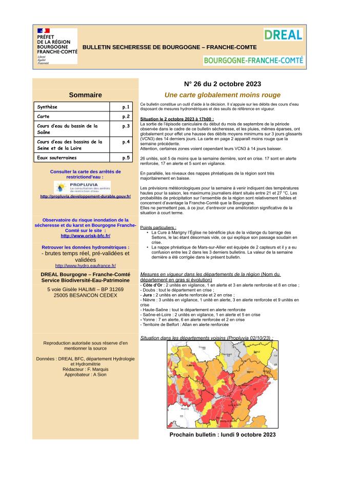 Bulletin Sécheresse BFC n°26 du 02-10-2023