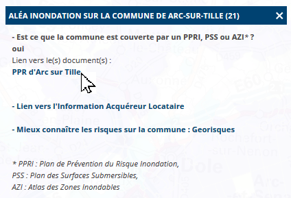 Lorsque l'on clique sur une commune (via l'outil main ou flèche), une fenêtre apparait (exemple ci-contre) listant le ou les documents existants sur la commune.