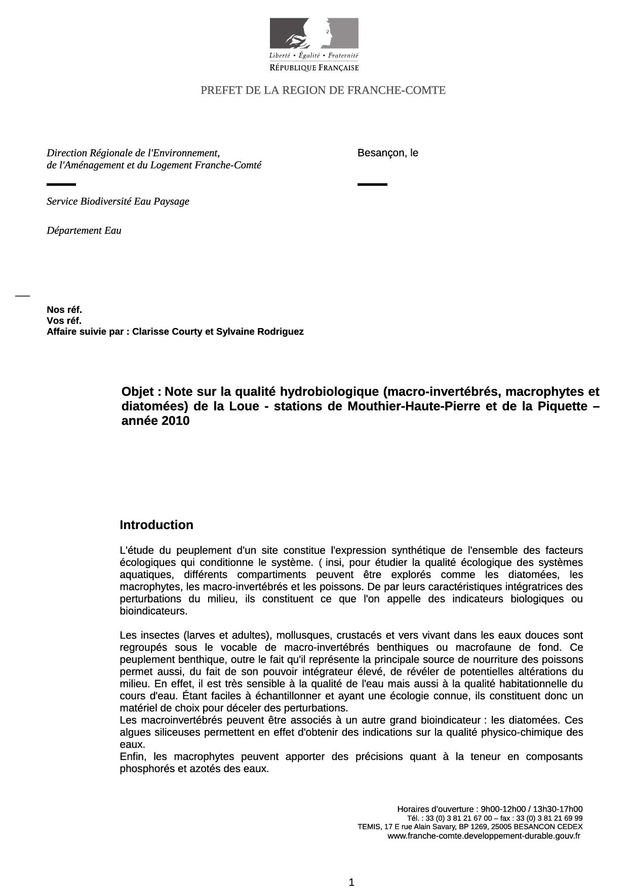 Note sur la qualité hydrobiologique (macro-invertébrés, macrophytes et diatomées) de la Loue – station de Mouthier-Haute- Pierre et de la Piquette (année 2010).