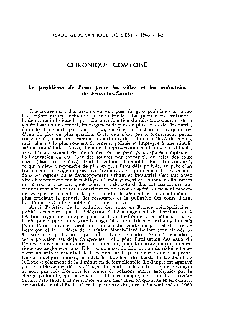 Chronique comtoise. Le problème de l'eau pour les villes et industries de Franche-Comté