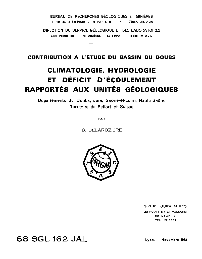 Contribution à l ' étude du bassin du Doubs : climatologie , hydrologie et déficit d'écoulement rapportés aux unités géologiques. Départements du Doubs, Jura, Saône-et-Loire, Haute-Saône, Territoire-de-Belfort, Suisse.